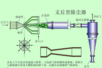 文丘里是一款新型除尘器,在水膜除尘器烟气进口管道上安装一个文丘里流道,在文丘里喉口喷水,因吸水凝聚成较大的颗粒。